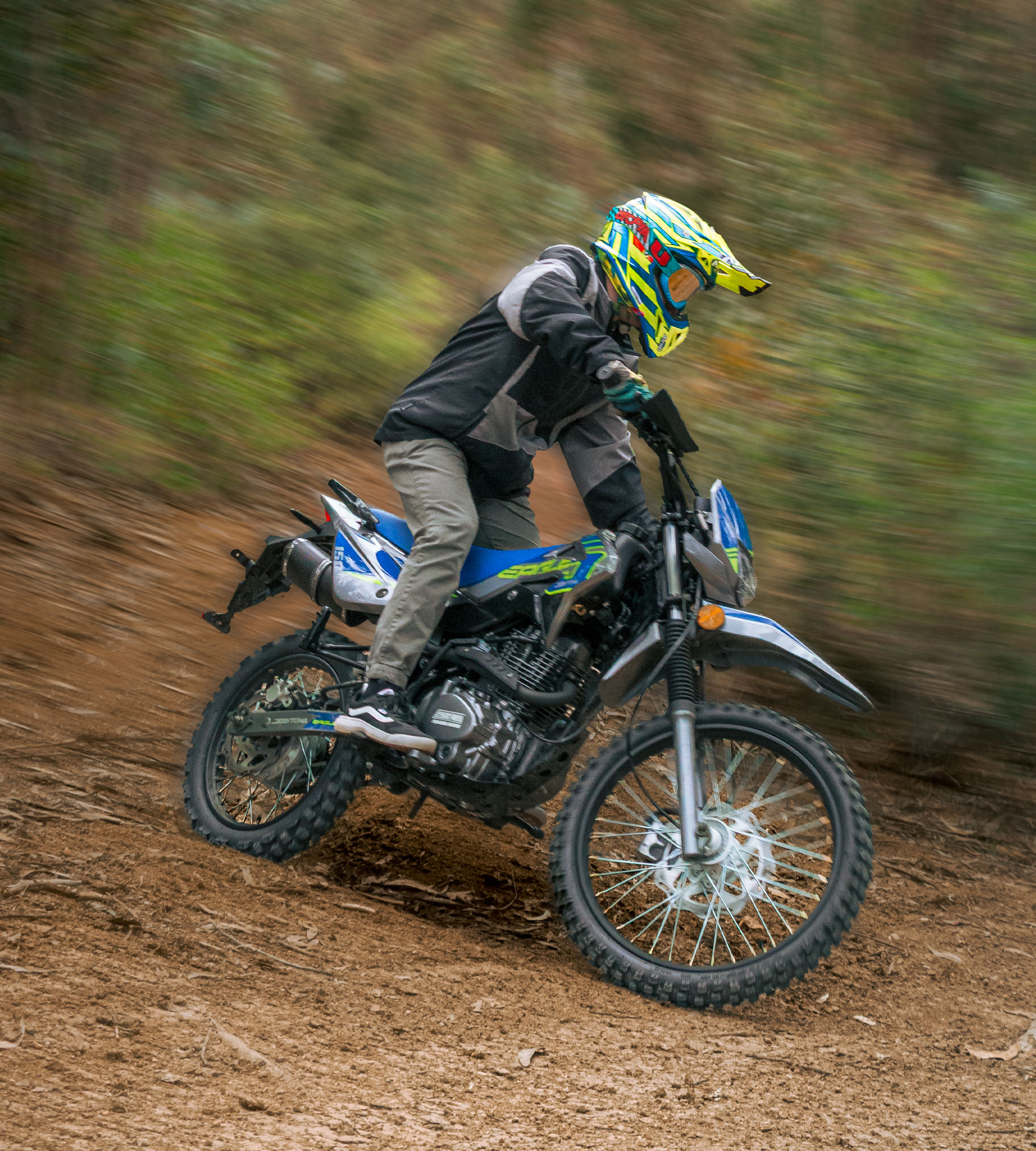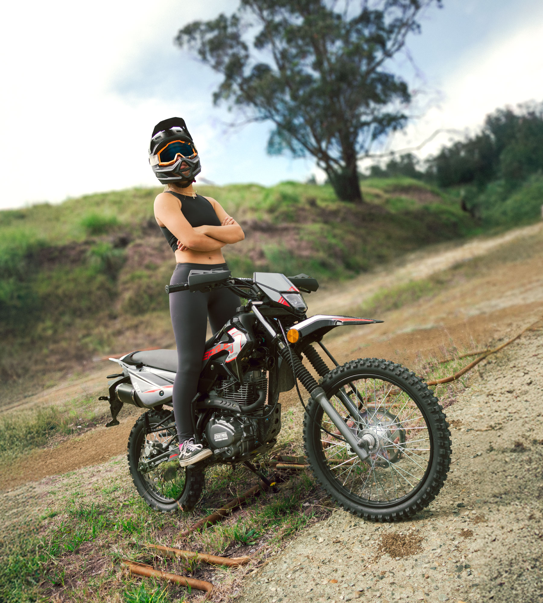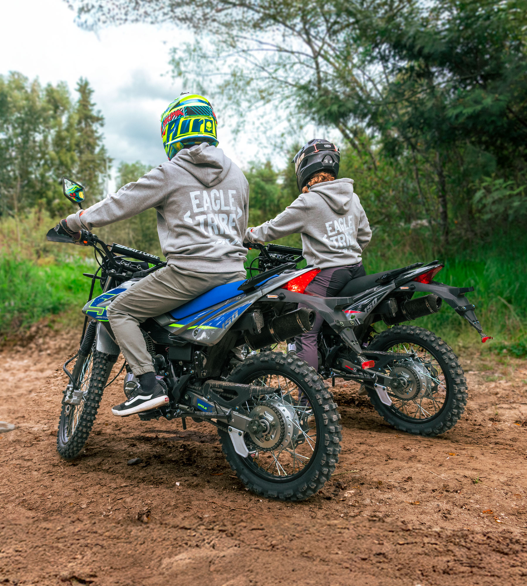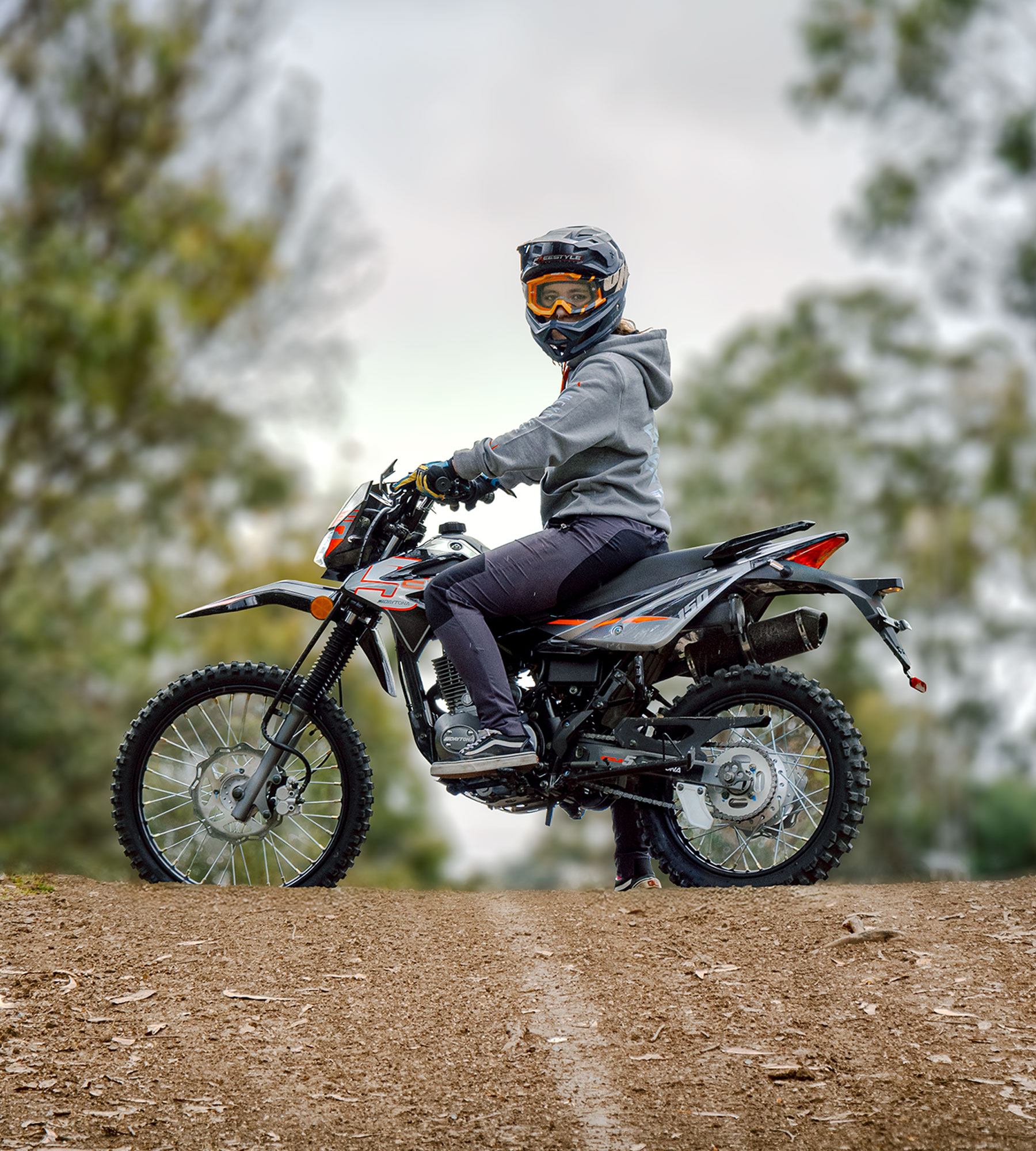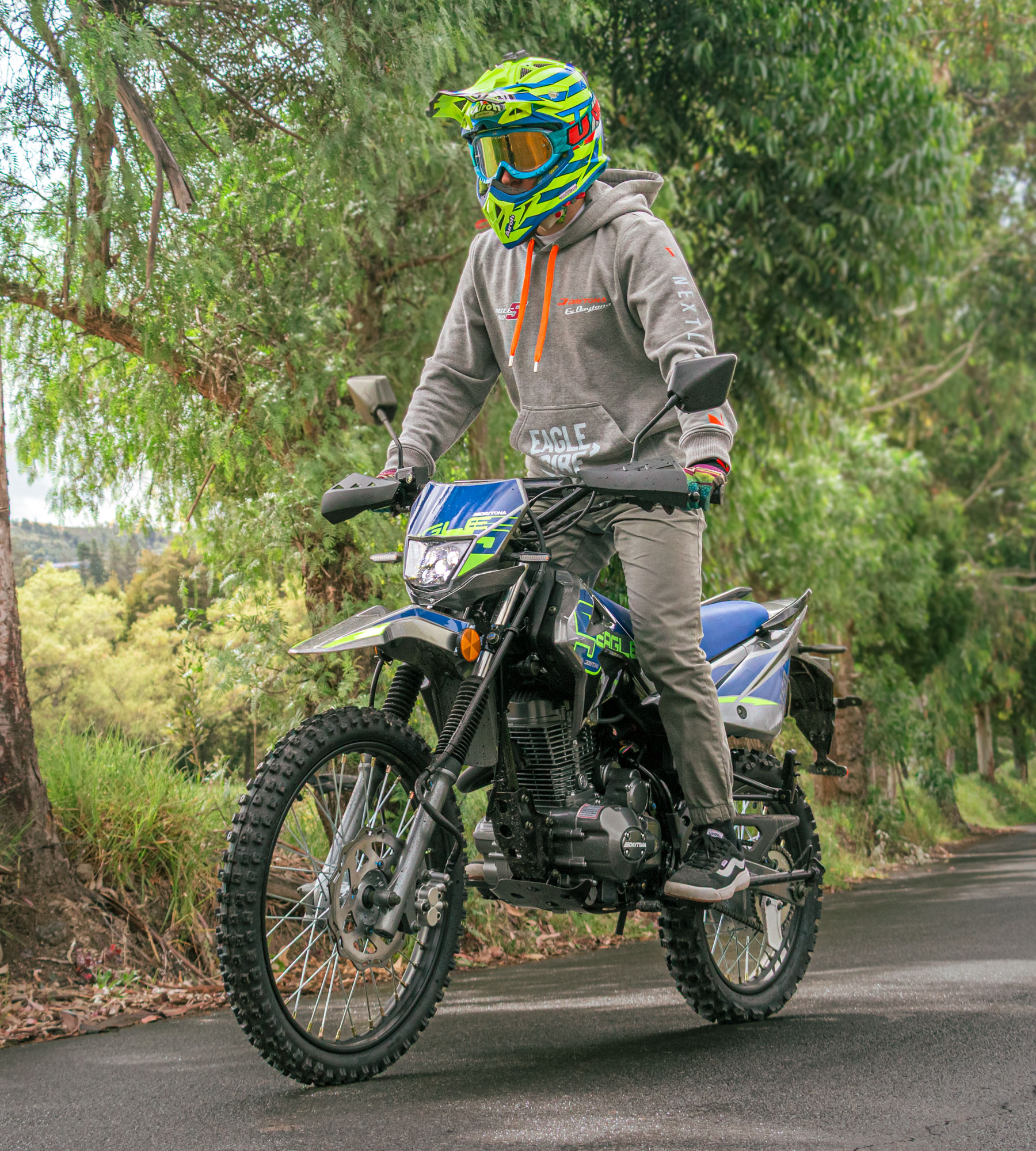 Llantas 70/100-19 y 90/100-16, con suspensión telescópica delantera y monoshock trasero. Perfecta para caminos irregulares, ciudad o campo.